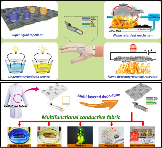 近日,化学工程领域顶级国际期刊<<Chemical Engineering Journal>>以Multifunctional conductive cellulose fabric with flexibility, superamphiphobicity and flame-retardancy for all-weather wearable smart electronic textiles and high-temperature warning device为题,报道了公司在可穿戴式多功能导电超浸润材料制备及其在火灾探测和预警方面应用的研究成果。