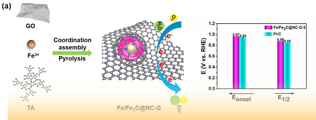 金属有机骨架(MOF)和无限配位聚合物由于其可调节的物理化学性质、丰富的孔隙和不受限制的金属-配体结合被认为是制备多功能碳纳米复合材料的固相前驱体。然而,直接在高温下煅烧原始MOF的方法经常会带来一些缺点:(1)金属纳米粒子的严重聚集;(2)掺杂原子的大量损失;(3)低的石墨化程度。为了使催化剂获得高的本征结构稳定性和导电性,碳材料通常被嵌入到纳米杂化结构中用于储能和转换。其中,氧化石墨烯(GO)由于其良好的化学稳定性和优异的导电性,被认为是ORR催化剂载体的一个很好的候选材料。虽然ORR电催化剂的制备已经取得了一些进展,但是由一种新型配位聚合物来制备具有大表面积、高度分散的Fe/C纳米催化剂,以实现反应物的快速扩散和边缘活性中心的充分暴露仍然是一个巨大的挑战。