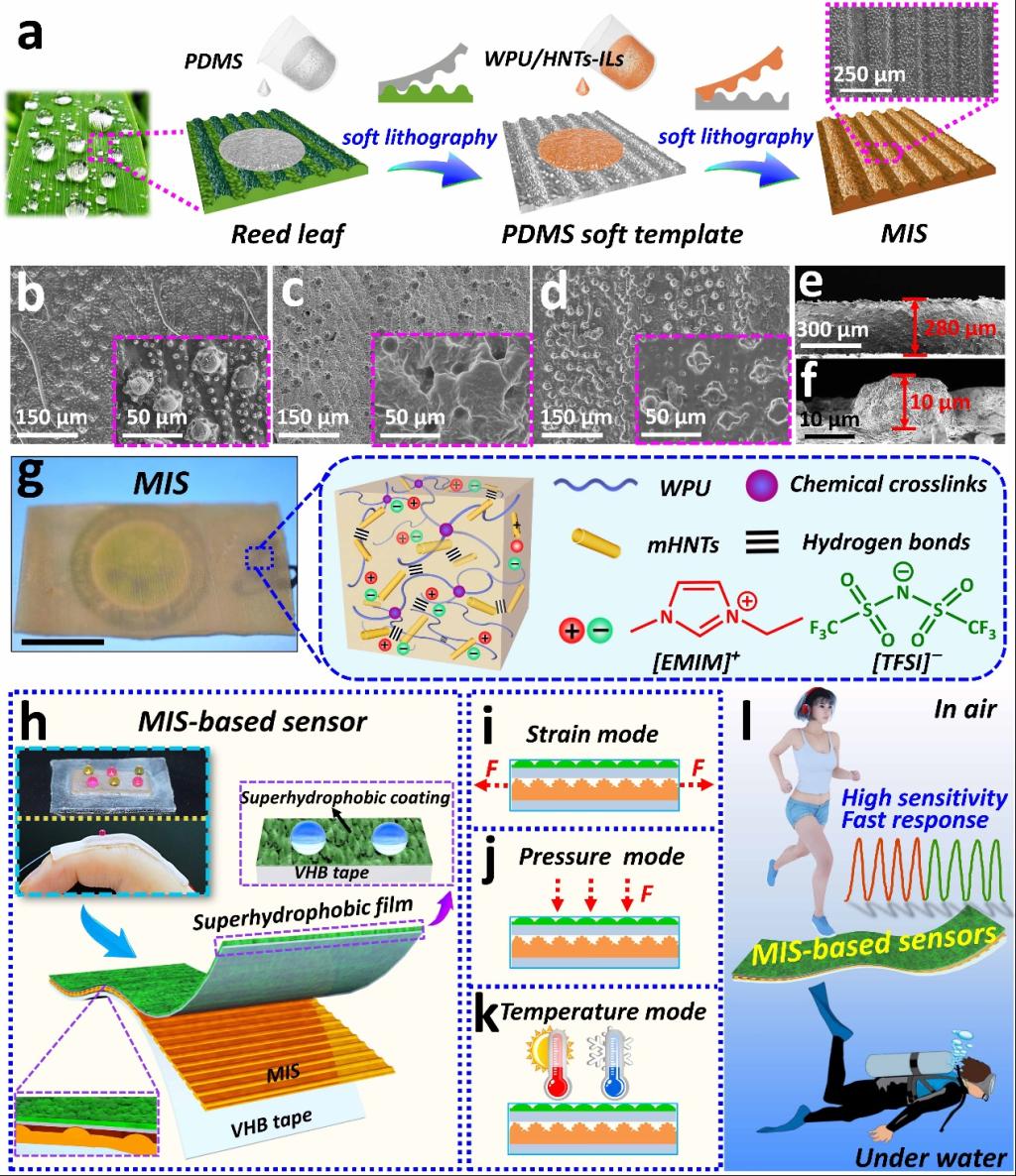 公司屈孟男教授和何金梅副教授研究团队通过生物模板法基于耐用且导电的WPU/mHNTs-ILs离子凝胶制备出一种具有仿生微结构的多功能离子皮肤(MIS)。这种离子凝胶是通过化学-机械相互作用,将mHNTs和[EMIM][TFSI]固定在由交联的WPU形成的聚合物网络中而获得的。其中,mHNTs用作纳米填料,以增强离子凝胶的机械性能并减少其吸水性,[EMIM][TFSI]作为导电离子液体,由于[EMIM]和[TFSI]都是疏水离子,可在离子凝胶基体中自由移动,从而有助于提高离子凝胶的导电性。MIS基体中化学键和机械键的共存赋予了其优异的力学性能。此外,特殊的单侧微纳米结构使其具备多类型信号检测能力。尽管具有上述优势,但WPU聚合物的固有的亲水性会导致MIS在潮湿环境中的传感性能不稳定。鉴于此,作者以高导电性 MIS 作为离子导电层,通过将 MIS 膜封装在两层丙烯酸弹性体膜之间,开发出具有优异超疏水性的 MIS传感器。由于表面独特的微纳结构和各种功能的巧妙结合,所制备的 MIS 传感器具有出色的传感性能,对应变 (0.1-400%)、压力 (0.001-15 kPa) 和温度 (25-95 °C) 表现出宽的传感范围,超低的检测限(0.1% 应变和0.001 kPa 压力)、快速响应(67 ms ~ 400%应变)、和超耐用的稳定性(超过 10000 次不间断的应变或压缩循环测试)。与现有离子凝胶传感器相比展现出具有竞争力甚至优越的综合性能。在应用方面,这种多功能 MIS 传感器不仅可以应用于可穿戴运动监测、多信号检测和高精度书写笔画识别,还能够检测由液滴或波浪、机器鱼或人体动作引起的水下微小振动,表现出高灵敏度、快速响应,卓越的耐用性及优异的可扩展性,在人体健康监测、人机交互、海洋环境保护和海洋生物研究等多种应用领域展现出良好的应用潜力,并且为开发用于可穿戴传感器和水下检测电子设备的高灵敏、多模式传感离子凝胶提供有前景的策略。