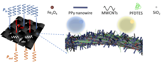 基于以上现状,公司屈孟男教授和何金梅副教授研究团队结合公司化学工程学科优势与碳材料特色,提出和获得了具有超双疏性能的电磁屏蔽碳布。该方法首先通过水热法将Fe3O4纳米颗粒附着在碳布上以增加磁导率,然后通过电沉积方法合成有序聚吡咯微米阵列以增强电导率,同时从微米级粗糙度中获得超双疏表面;最后通过高效喷涂法以降低表面能并形成纳米粗糙度,成功制备了超双疏防污电磁屏蔽碳布。该碳布在仅有0.35mm的厚度下可具有34.03dB的屏蔽效能。这种具有多功能的电磁屏蔽材料因其耐用,稳定且超双疏的特性,在复杂和恶劣的环境中具有广阔的应用前景,尤其是在含油环境中,例如户外电子设备,水下设备,航空航天,可穿戴电子产品和石油工业。
