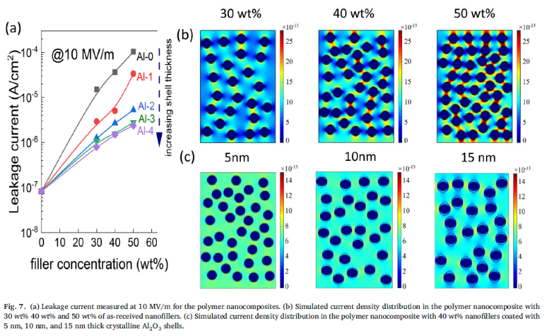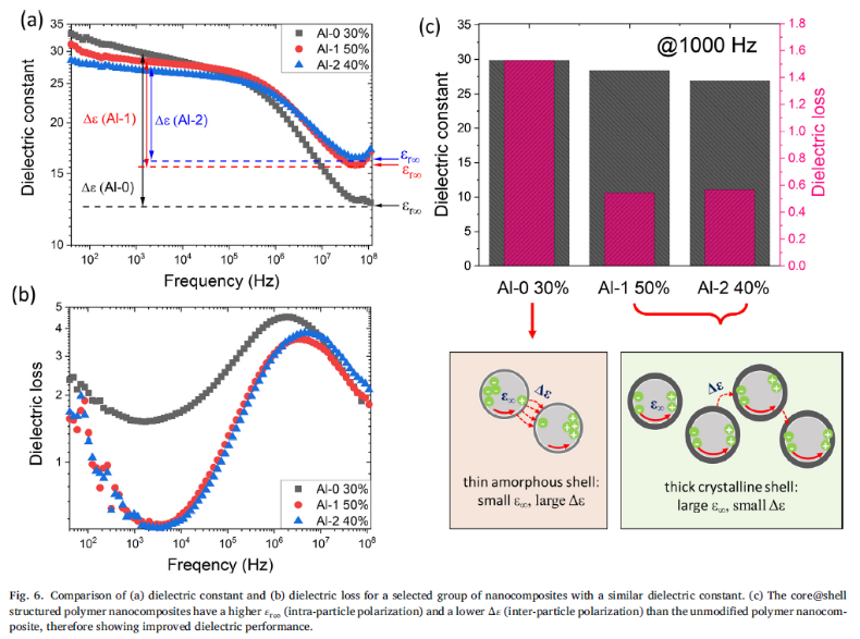 针对此问题,我们设计和制备了系列含不同厚度及结构(非晶及晶体)的氧化铝外壳的核壳结构铝粒子,和聚偏氟乙烯复合后,研究了填料含量及外壳结构对纳米复合材料的结构及介电性能影响。晶体氧化铝外壳对纳米复合材料的低场及高场介电性能的影响结果表明,绝缘壳的引入绝非仅仅降低了损耗,Al@Al2O3/PVDF的高介电常数主要源自粒子内的快速极化(粒子内的电子极化)和粒子间的慢极化(粒子间的电子迁移),相比常规逾渗体系中2类极化的耦合关系和不能协同调节状况,本研究中的构筑的Al2O3晶体外壳利于独立或解耦控制2类不同的快、慢极化模式。通过改变填料含量及外壳结构促进粒子内的快极化,抑制粒子间的慢极化,核壳结构纳米复合材料能获得同步的高介电常数及低损耗,介电性能远超过表面未改性粒子体系的。此外,随着非晶氧化铝外壳转化为晶体结构,复合粒子的热导率逐步提高,纳米复合材料的导热性能及高电场下的绝缘电阻相应得到提高和改善,使得在高电压下运行的材料因良好的散热效果及高绝缘特性而处于安全和稳定的低温环境,部分实验结果见图5-7,9所示。本研究结果为设计同步具备高介电常数、低损耗及良好热机械性能的逾渗复合材料提供了有益参考。