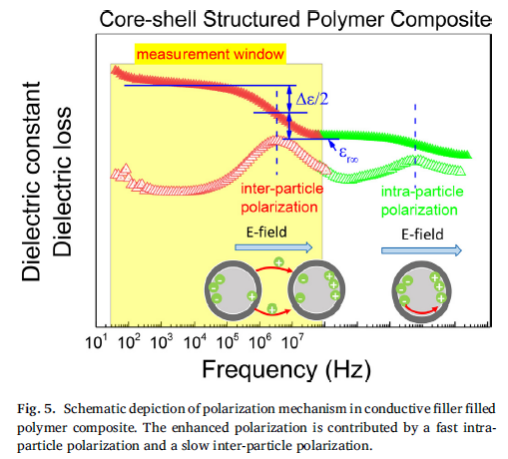 基于核壳结构策略在显著降低导体粒子/聚合物体系的损耗同时,也明显抑制和减少了介电常数,损耗降低往往以减少体系的介电常数为代价的,也有零星报道由于多层壳间的极化增强效应带来了体系介电常数的额外升高,但相比未包覆粒子而言介电常数下降是主流。由此引出一个多年来很少探究的问题,核壳结构粒子是否最终利于改善体系的介电性能?同样,粒子含量也对介电性能有影响,降低含量可有效降低损耗。因此,厚壳和高含量粒子同薄壳、低含量粒子2个因素相比,那个因素更利于改善体系的介电性能?所以,就提升复合材料的整体介电性能而言,核壳结构的本质作用是什么,如何在最佳壳厚度处介电性能获得同步提升。目前对如上问题仍缺乏物理解释和深入研究。