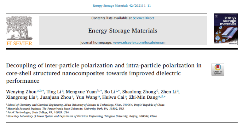 太阳集团122cc先进电工材料研究中心在全球储能材料领域的著名刊物 Energy Storage Materials (2020, IF=17.78), 2021,42,1-11上发表了题为“Decoupling of inter-particle polarization and intra-particle polarization in core-shell structured nanocomposites towards improved dielectric performance”的研究论文。