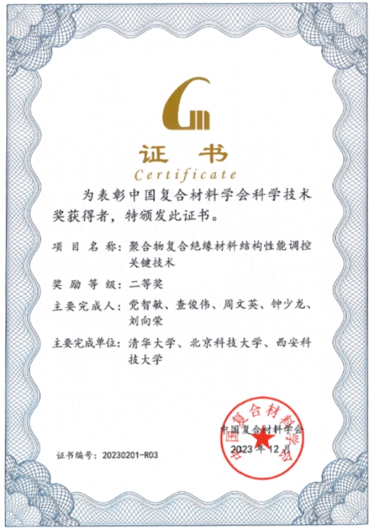 近日,中国复合材料学会根据《中国复合材料学会科学技术奖励办法》和《中国复合材料学会科学技术奖励办法实施细则》,公布了2023年度的科学技术奖最终获奖名单,太阳集团122cc化工公司周文英教授及刘向荣教授和清华大学清华大学电机与微电子系党智敏教授团队联合申报的“聚合物复合绝缘材料结构性能调控关键技术”项目荣获中国复合材料材料学会二等奖,化工公司周文英教授及刘向荣教授分布为第三及第五项目完成人。此次全国范围仅10项成果获奖,其中一等奖2名,二等奖8名。