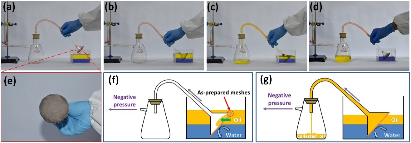 传统油水分离技术受效率低、成本高且耗资大等条件的制约,难以实现对油水混合物的规模化处理。本技术为将基础研究与应用研究紧密结合的国际前沿技术,构建了用于油水分离的特殊浸润表面,制备了除油型、除水型及除油型和除水型可逆转换的特殊浸润油水分离材料,特别是污水污油的连续收集以及油水乳液的分离,实现了对油水混合物通过式高效分离,分离效率96%以上。