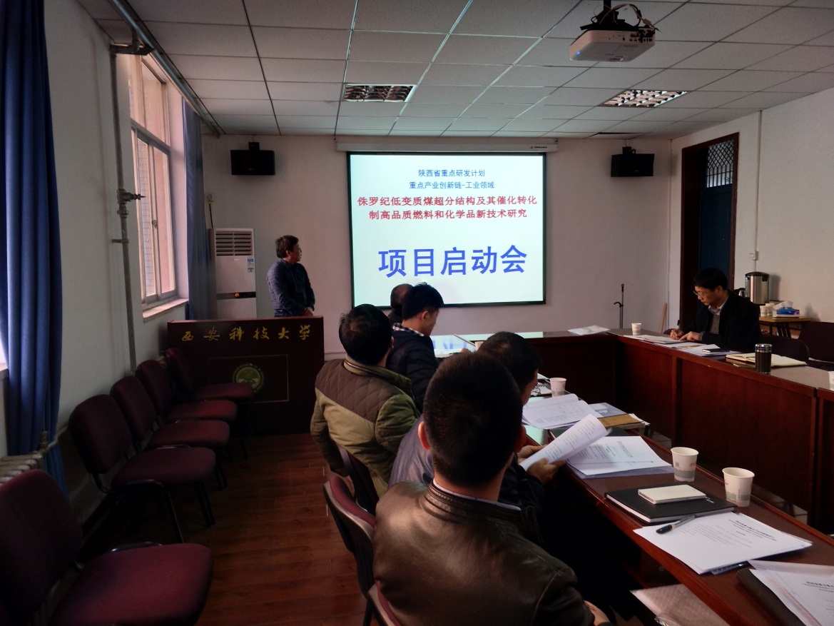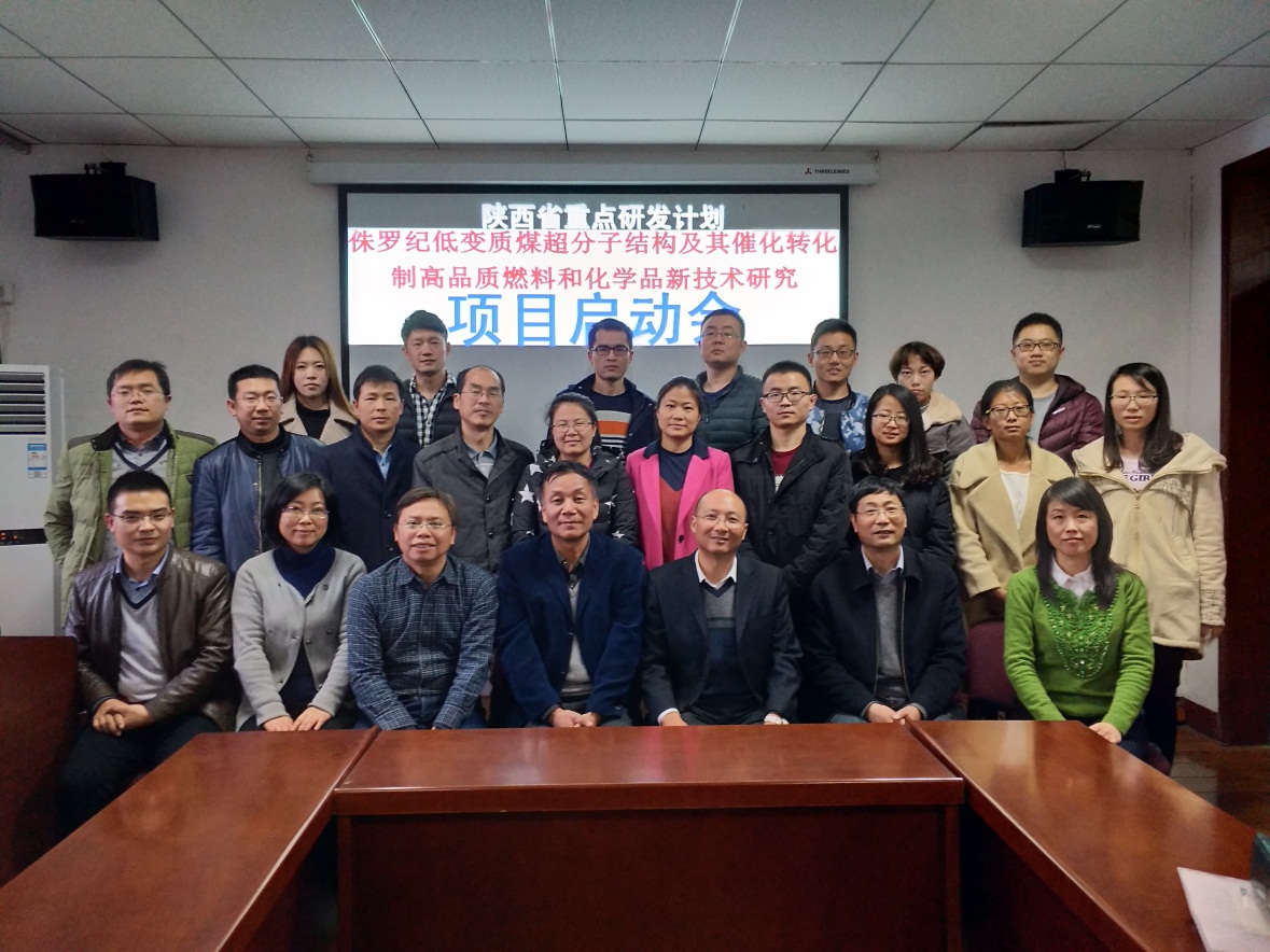 2017年11月28日在太阳集团122cc会议室召开了陕西省2017年重点创新产业链项目“侏罗纪低变质煤超分子结构及其催化转化高品质燃料和化学品新技术研究”项目启动会。本次会议由化工公司周安宁教授主持,参会人员有化工公司领导杜美利经理和张亚婷副经理、科技处领导戴开文副处长、项目联合单位陕西煤田地质局代表以及项目组成员。