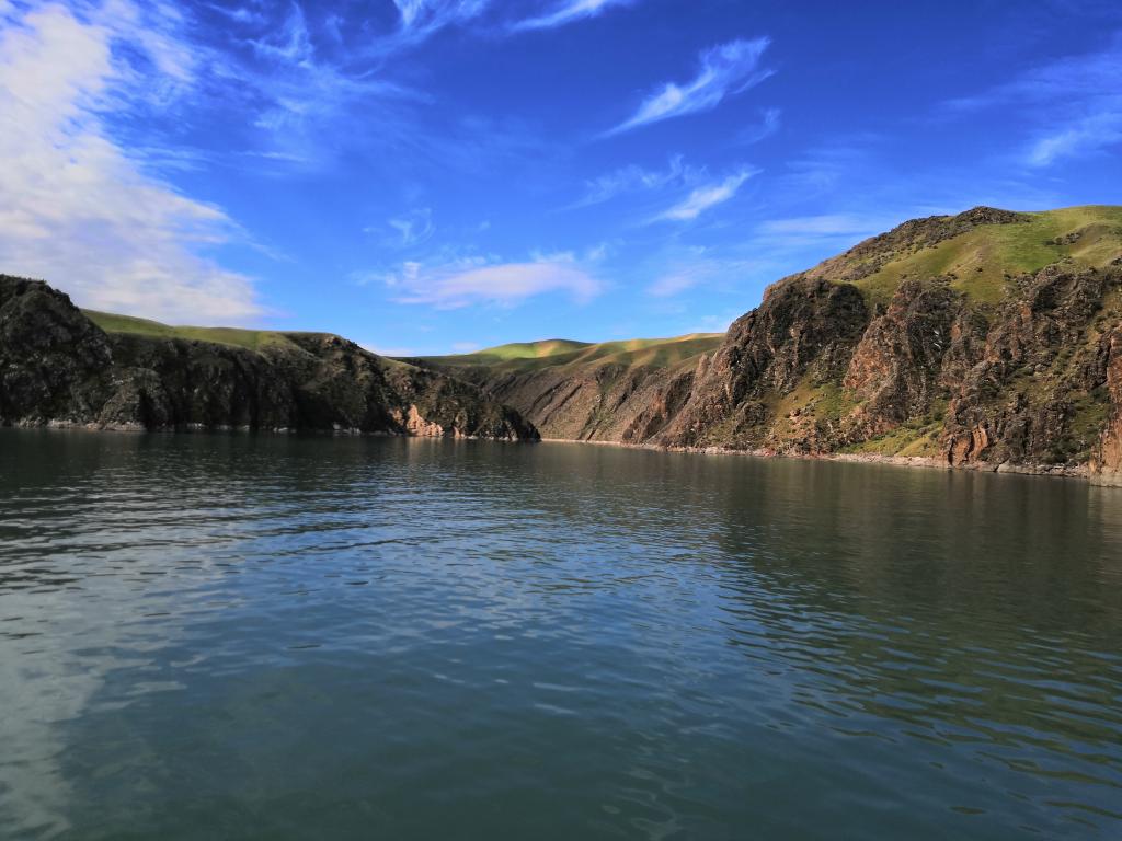 (代爱萍---群山环绕的湖水恰好与碧蓝的天空、缥缈的白云构成一幅美丽的山水画。)