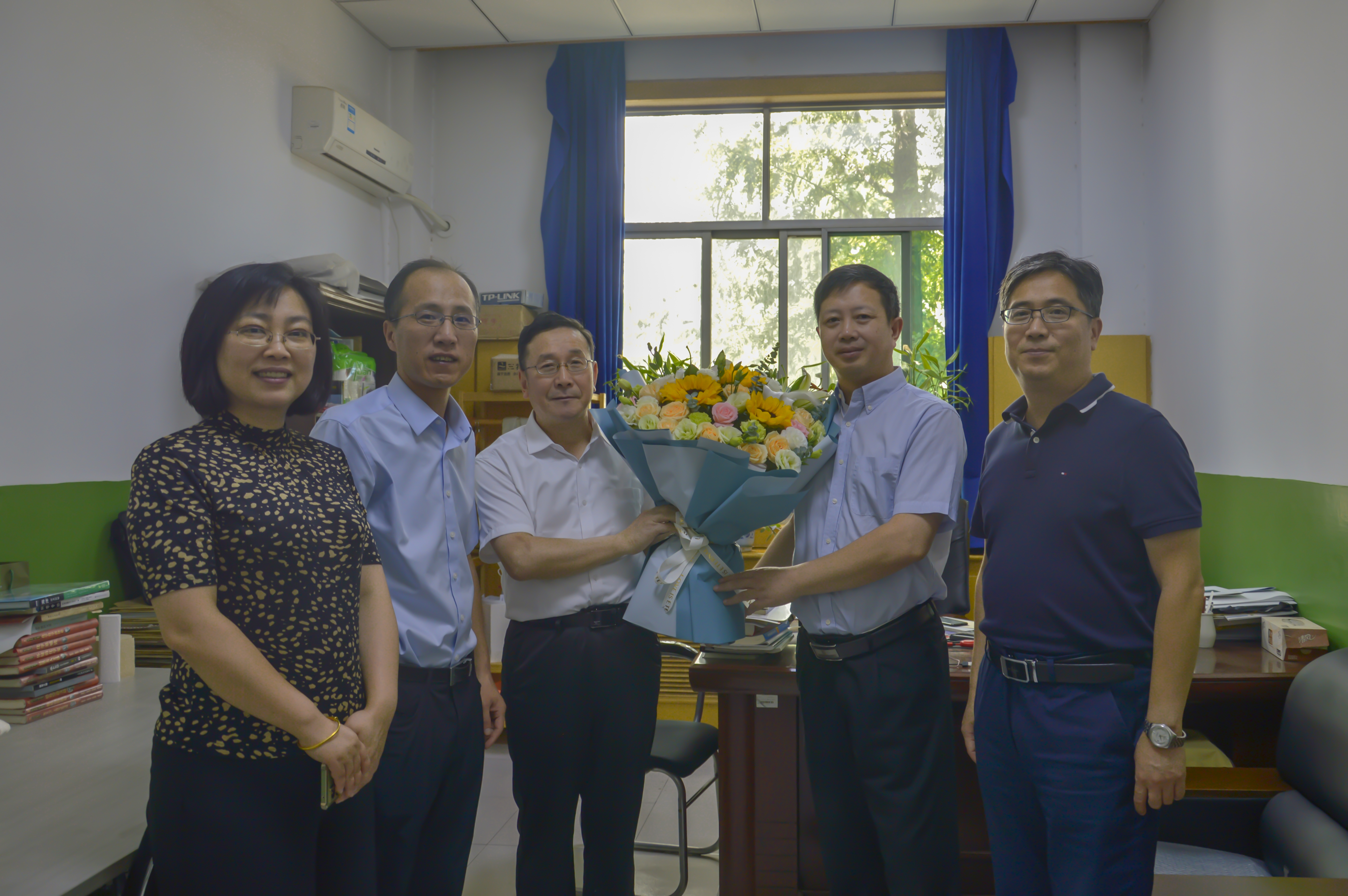 在李侃社老师办公室,黄英维副董事长为李教授送上了鲜花和诚挚的关怀,并与李教授亲切交谈,详细了解了李教授的日常生活和教学科研情况。了解到李教授已在公司兢兢业业工作了30余年,为公司教育建设与发展奉献出了自己的力量,目前正致力于化工学科评估工作,黄董事长对李教授的严谨治学精神和科研态度给予了高度肯定,并鼓励李教授在工作和生活上继续保持良好的状态,为公司团队建设发展再立新功。