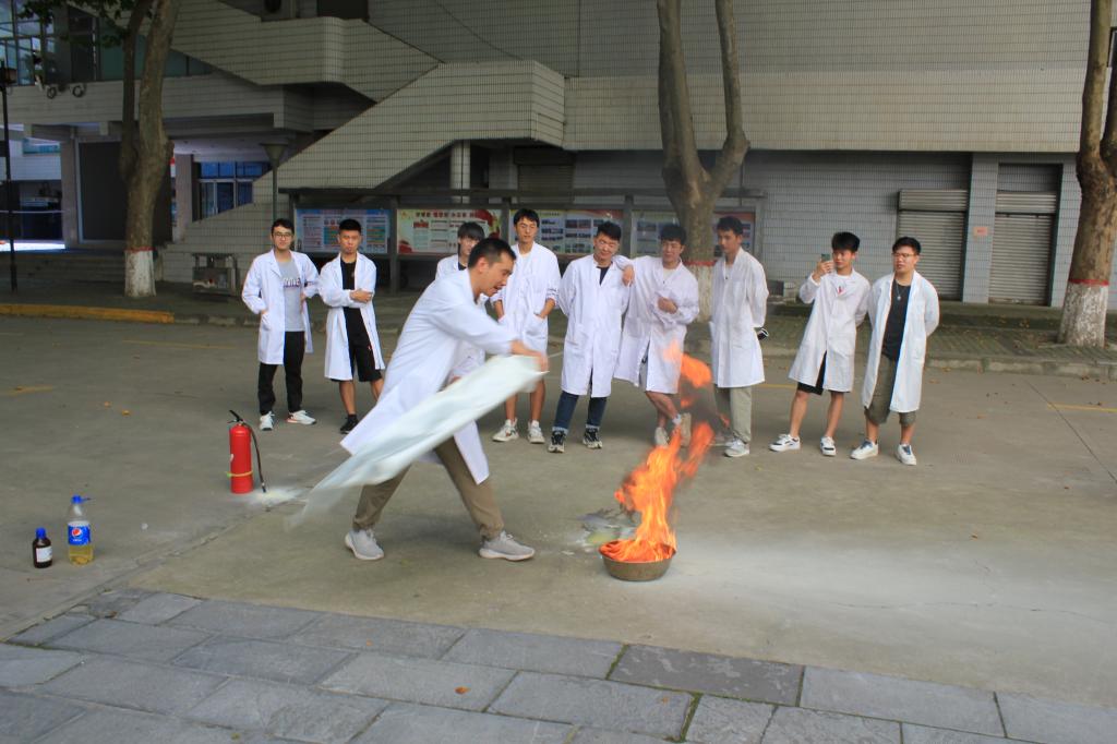 最后,举行了危险化学品突发火灾应急演练。演习了模拟油类及低沸点有机易燃物突发着火事故的扑灭方式,学习了灭火器、灭火毯及消防沙箱的正确使用方法及适用范围。
