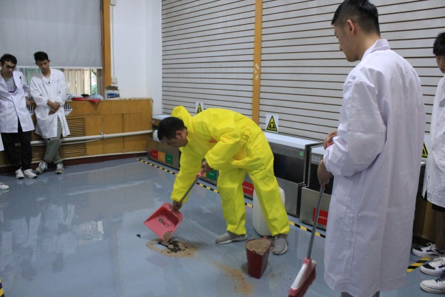 其次,开展危险废物及化学品突发泄漏演练。实验室安全管理老师带领同学们实操练习了危废物及化学品突发泄露事故的处理方法。演习模拟仓库及运输过程中废液及废固容器破损、碰倒等造成的淋洒、泄漏及其应急处置措施。