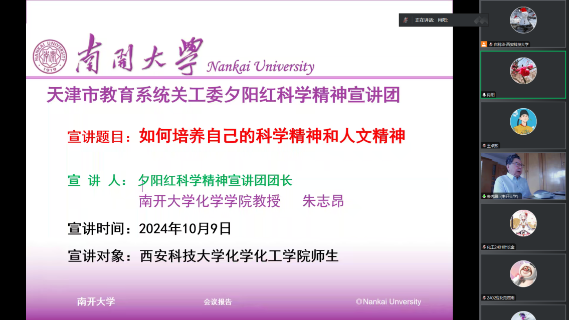 10月9日,天津市夕阳红科学精神宣讲团团长、南开大学化学公司教授朱志昂受化工公司刘向荣教授邀请为太阳集团122cc师生作题为“如何培养自己的科学精神和人文精神”的专题报告。报告会由公司党委书记肖阳同志主持,化工公司本科生、化学专业研究生及化学系党支部教师参加了会议。