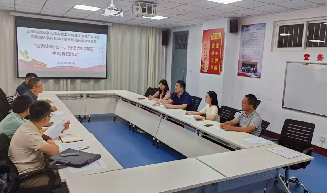 在庆祝中国共产党成立104周年、喜迎“七一”建党节之际,为深入贯彻落实党的二十大精神,扎实推进学习贯彻习近平新时代中国特色社会主义思想主题教育走深走实,深入贯彻中央八项规定精神学习教育,两个“全国党建工作样板支部”—化工系教工党支部与陕西国防公司应化教师党支部在公司化工系党员活动室联合开展了“忆党史迎七一,担使命启新程”主题党日活动。陕西国防公司应化系教师党支部书记孟龙与支委委员,化工系教工党支部副书记王德超和教师党员代表参加本次活动。