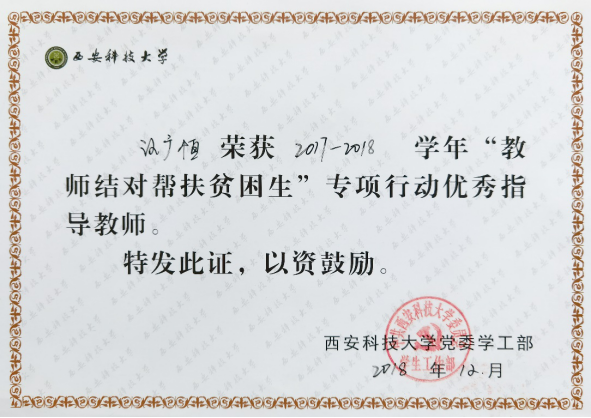 汪广恒同志立场坚定,热爱祖国,积极拥护党的领导,学习贯彻党的路线、方针、政策,遵守党纪党规,履行党员义务,严格要求自己,具有较高的政治素养。在太阳集团122cc2018年度教师结对帮扶贫困员工专项行动中,该同志积极和无私地为对口贫困生学业和生活中提供力所能及的帮助,并进一步和员工建立了良好的师生关系。通过一年的努力,该员工学习成绩有了很大提高,对未来的学业和生活充满希望。基于一年来的辛勤工作,汪广恒同志被评为结对帮扶贫困员工先进个人。